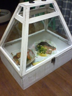 帰宅したらテーブルの上に、妙なハウスとその中に入った晩御飯がありました。ママンが「あんたのごはんを猫たちから守るのよ」と自分のお店で買ってきたんだそうです。この白いのね、ほんとにねハウスなの。ママンの勤め先、園芸屋さんだから。