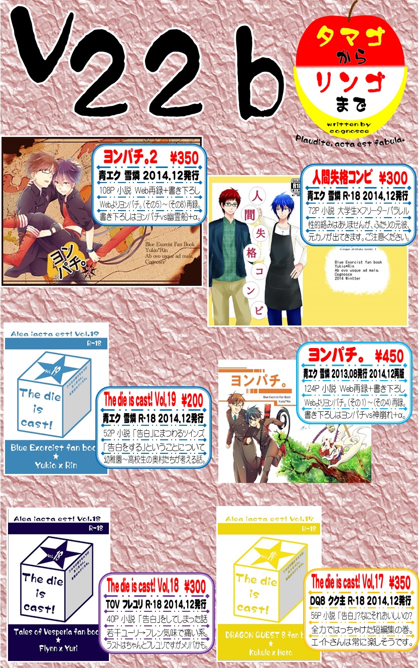 青エク既刊、「The die is cast! Vol.13」「The TaroT」「燐廻」を一冊ずつですね、了解いたしました! 卓上にはならべておりませんので、当日お声をかけてやってください。お待ちしております!